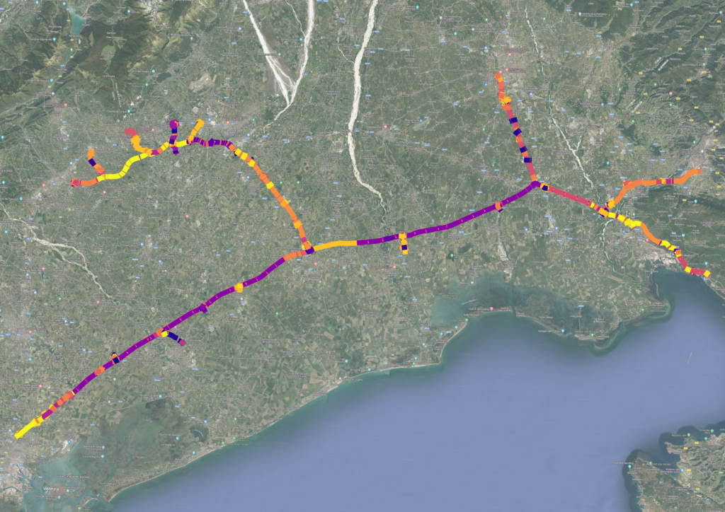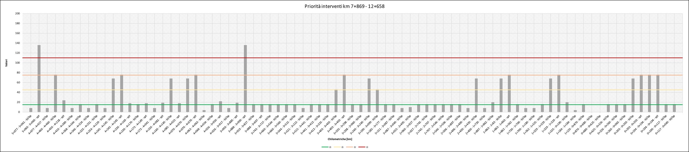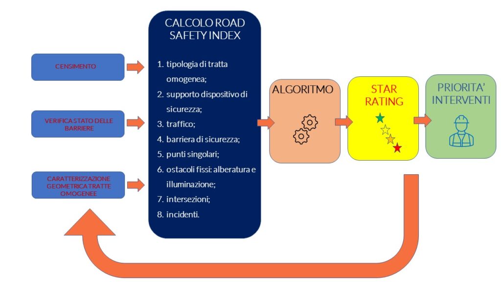 Calculated the overall value of the “Road Protection Score,” which takes into account all the data collected, for each homogeneous section the qualitative level of the state of existing restraint devices is assigned and the type, as well as the priority of interventions “Star Rating”, is evaluated.